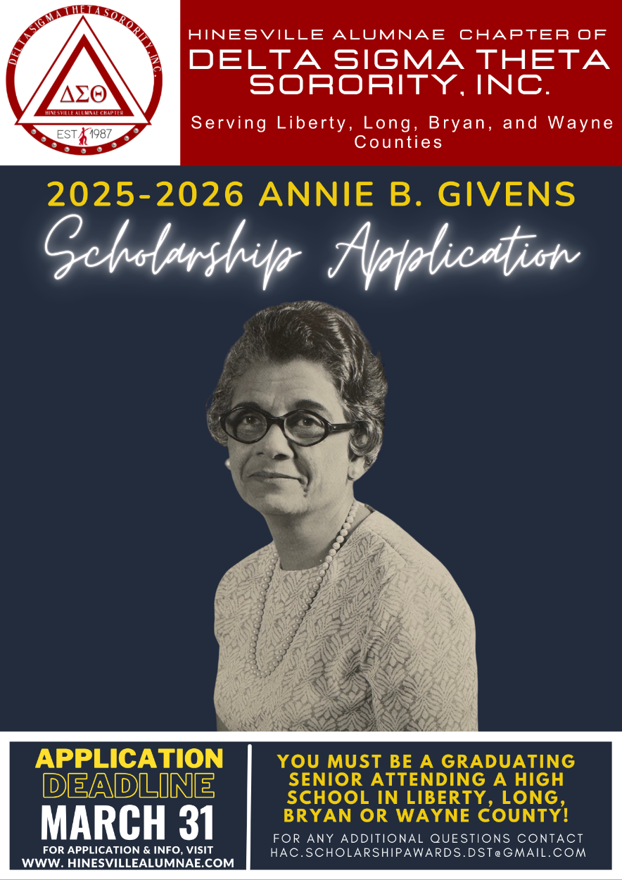 The Hinesville Alumnae Chapter renamed our scholarship program the Annie B. Givens Scholarship in 2010, in honor of the late Annie B. Givens, a Soror and Charter member of this chapter. Soror Givens earned a bachelor's degree in 1938 and a master's degree in 1964 from Hampton Institute (now University) in Hampton, VA. Soror Givens taught public schools in Waverly and Norfolk, VA, Chatham County, and Liberty County. She retired from Bradwell Institute in 1977, having become the first Black faculty member in 1966.